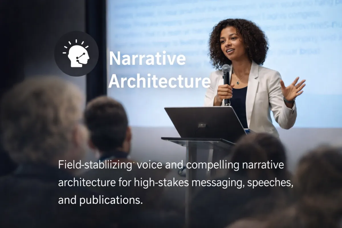 The Loft offers compelling, field-stabilizing voice and narrative architecture for high-stakes messaging, flagship campaigns, speeches, and publications.